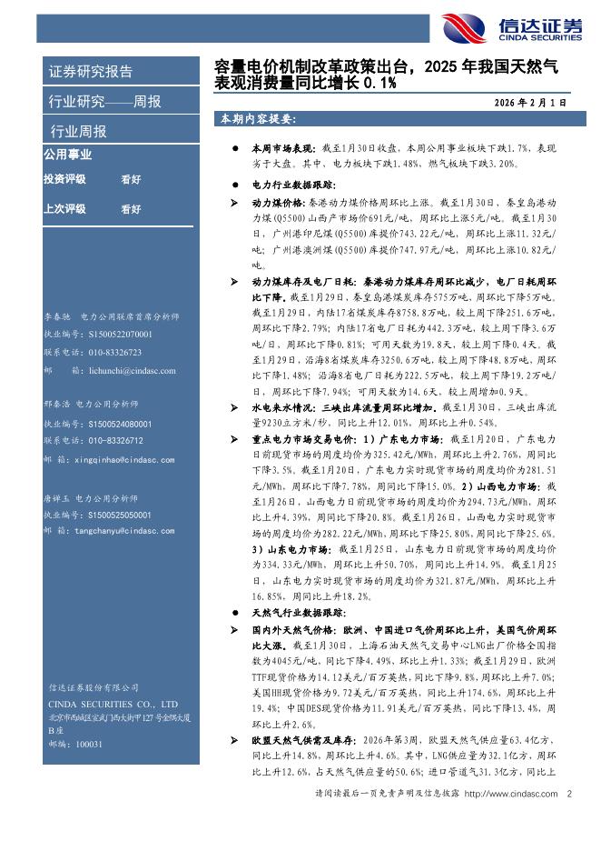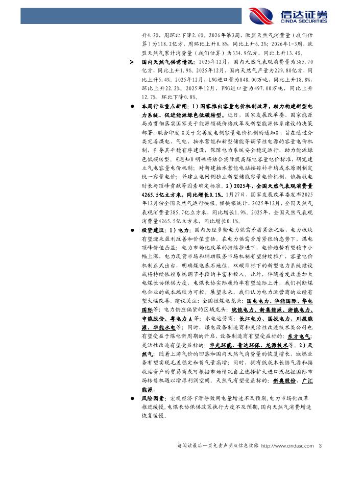 信达证券:公用事业-电力天然气行业周报:容量电价机制改革政策出台,2025年我国天然气表观消费量同比增长0.1%.pdf
