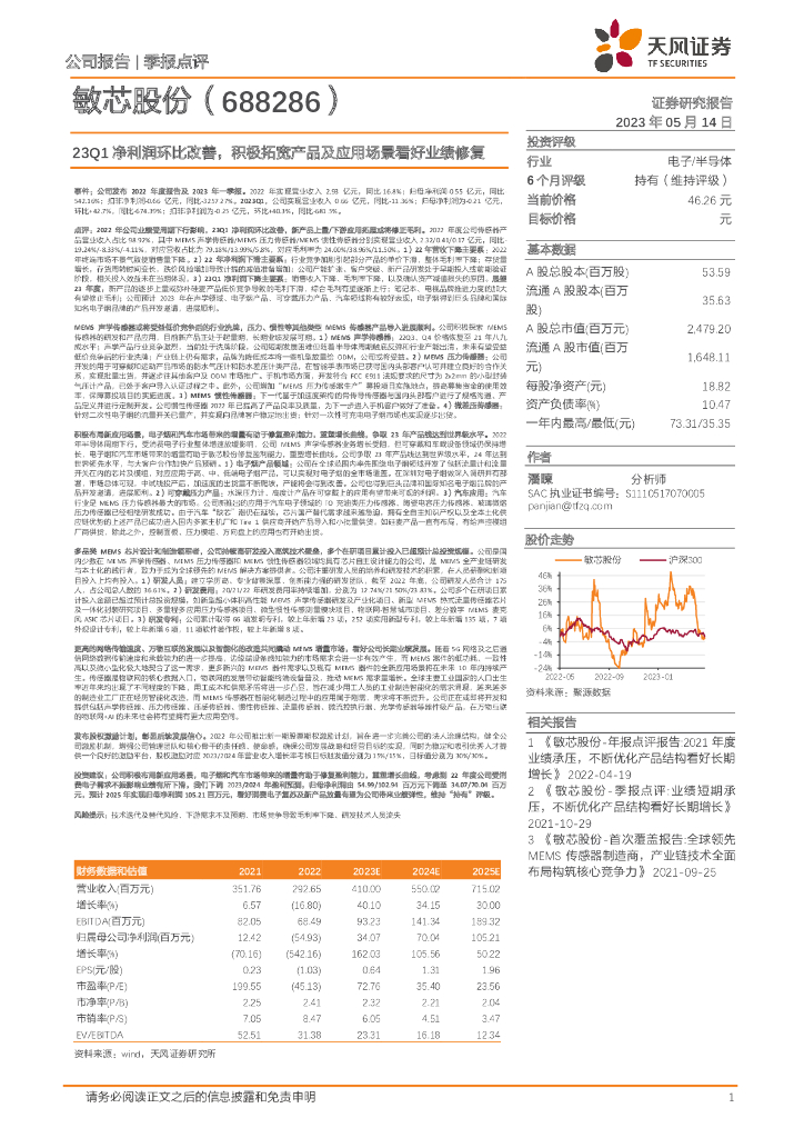 天风证券:敏芯股份(688286)-23Q1净利润环比改善,积极拓宽产品及应用场景看好业绩修复.pdf