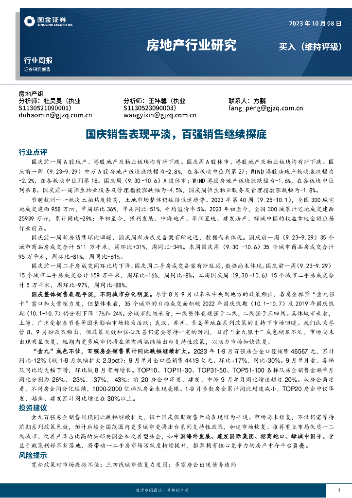 国金证券:房地产行业周报:国庆销售表现平淡,百强销售继续探底.pdf