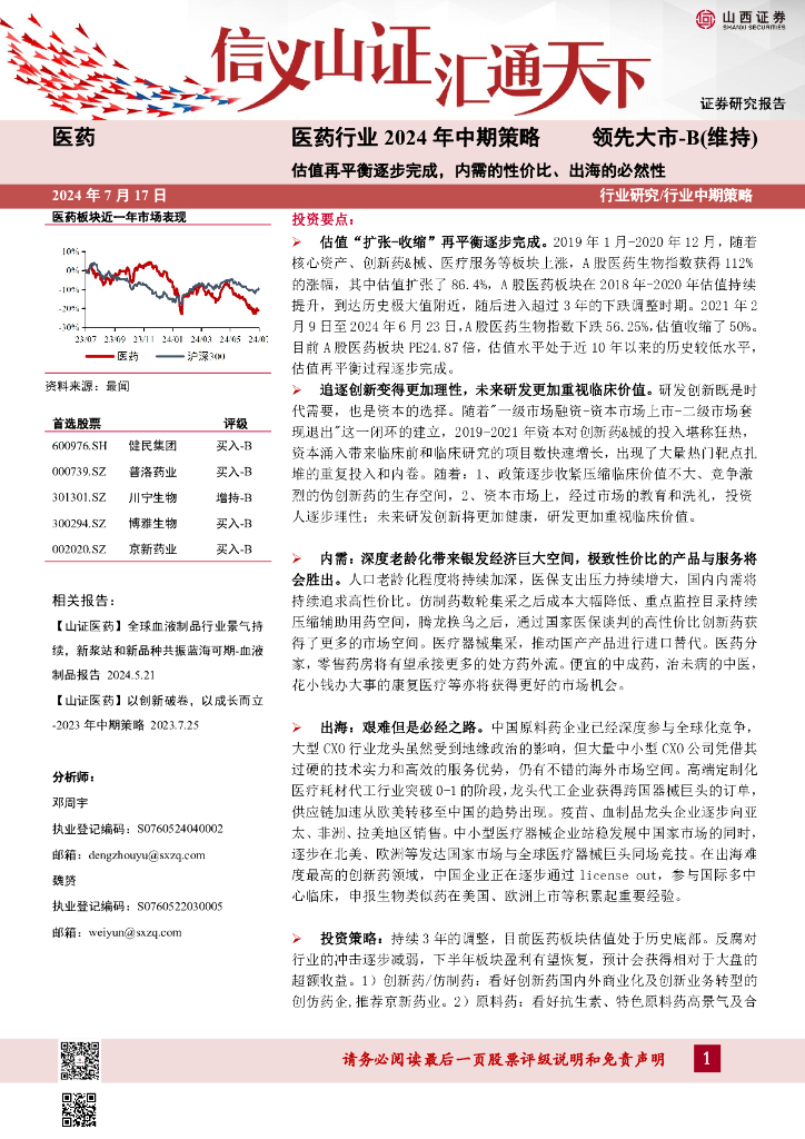 山西证券:医药行业2024年中期策略:估值再平衡逐步完成,内需的性价比、出海的必然性.pdf