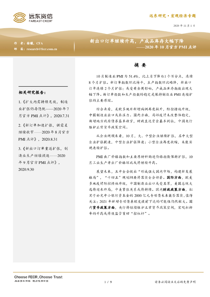 远东资信:新出口订单继续升高,产成品库存大幅下降——2020年10月官方PMI点评.pdf