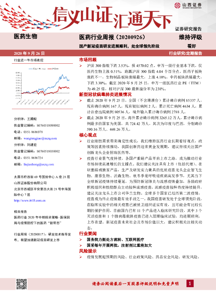 山西证券:医药行业周报:国产新冠疫苗研发进展顺利,处全球领先阶段.pdf
