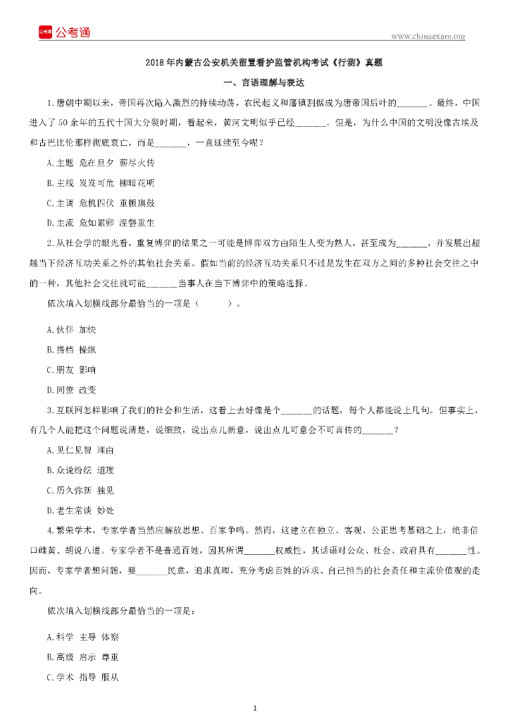 2018年内蒙古公安机关留置看护监管机构考试《行测》真题.pdf