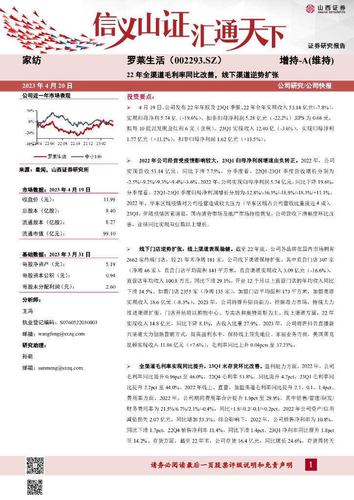 山西证券:罗莱生活(002293)-22年全渠道毛利率同比改善,线下渠道逆势扩张.pdf