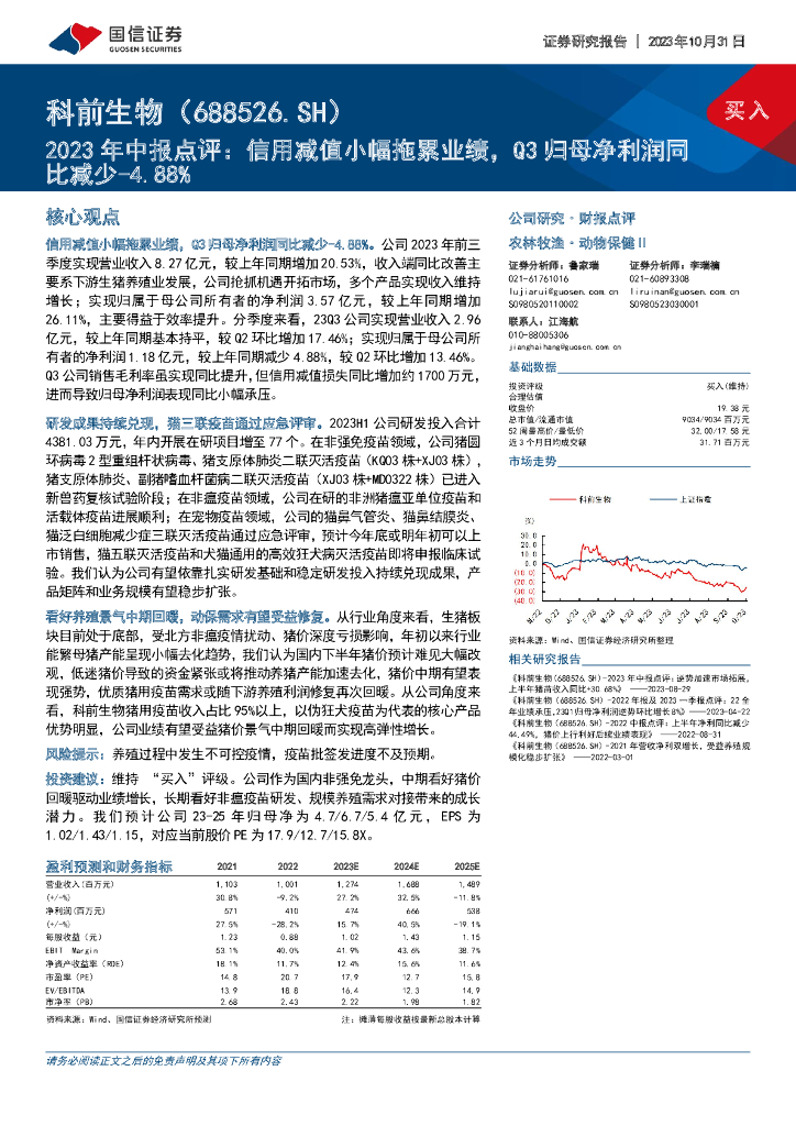 国信证券:科前生物(688526)-2023年中报点评:信用减值小幅拖累业绩,Q3归母净利润同比减少-4.88%.pdf