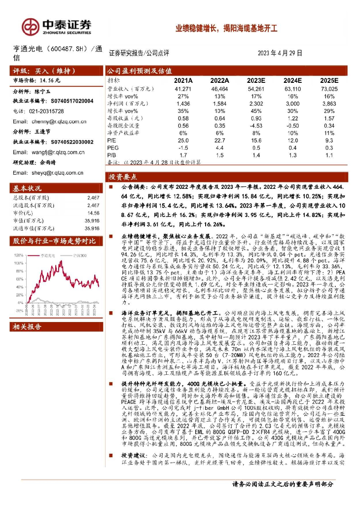 中泰证券:亨通光电(600487)-业绩稳健增长,揭阳海缆基地开工.pdf