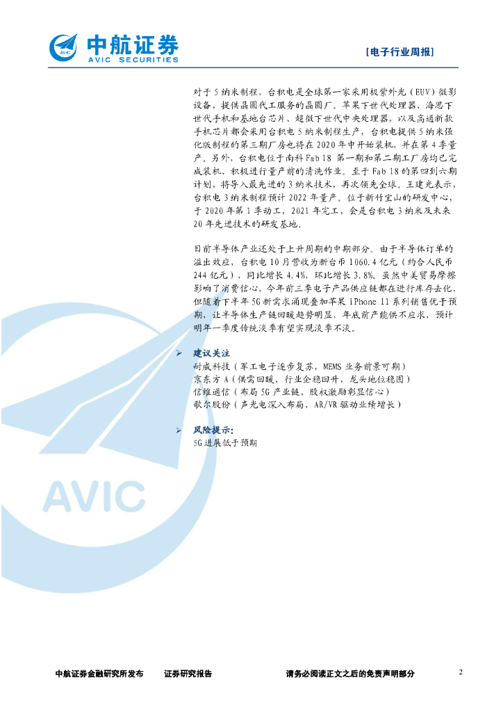 中航证券:电子行业周报:台积电5纳米明年量产,持续看好半导体产业链.pdf