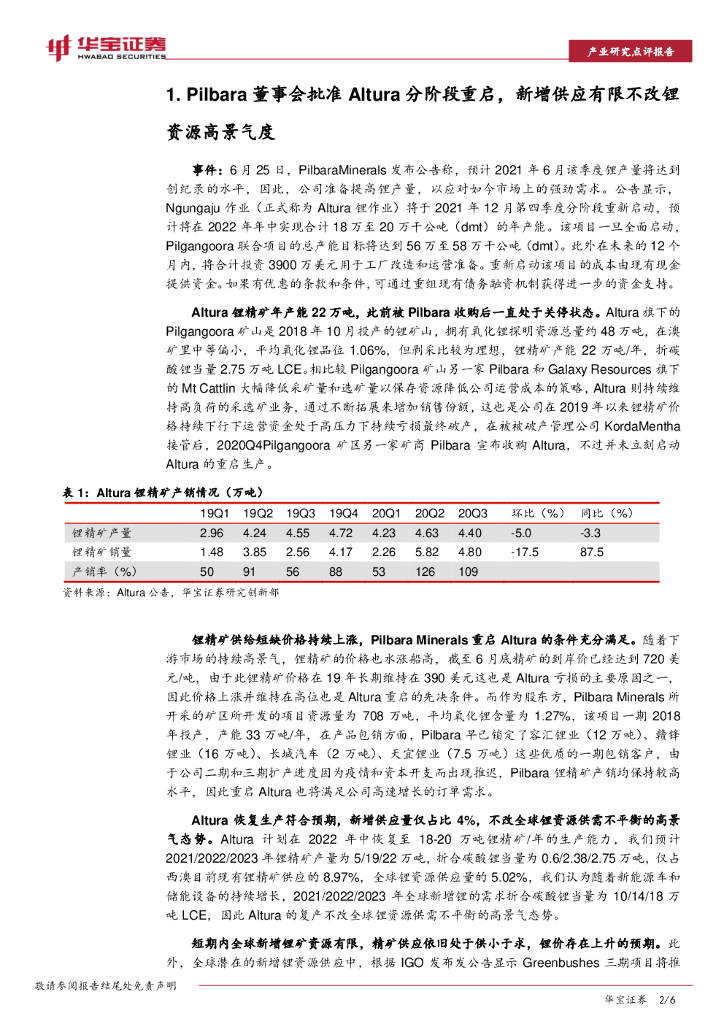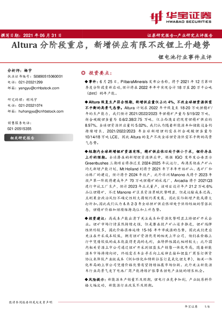 华宝证券:锂电池行业事件点评:Altura分阶段重启,新增供应有限不改锂上升趋势.pdf