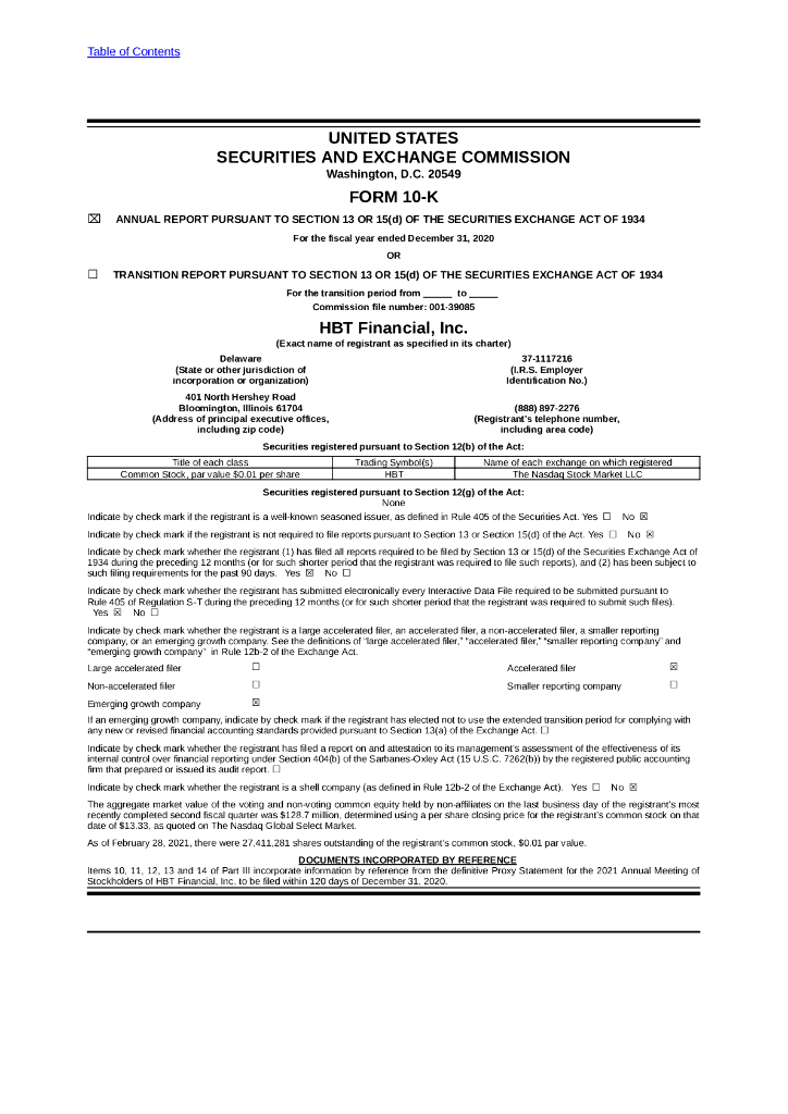HBT Financial, Inc.(HBT)2020财年年度报告(英文版).pdf