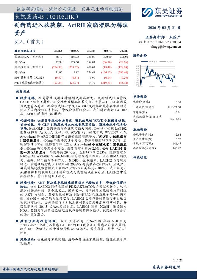 东吴证券:来凯医药(02105.HK)创新药进入收获期,ActRII减脂增肌为稀缺资产.pdf