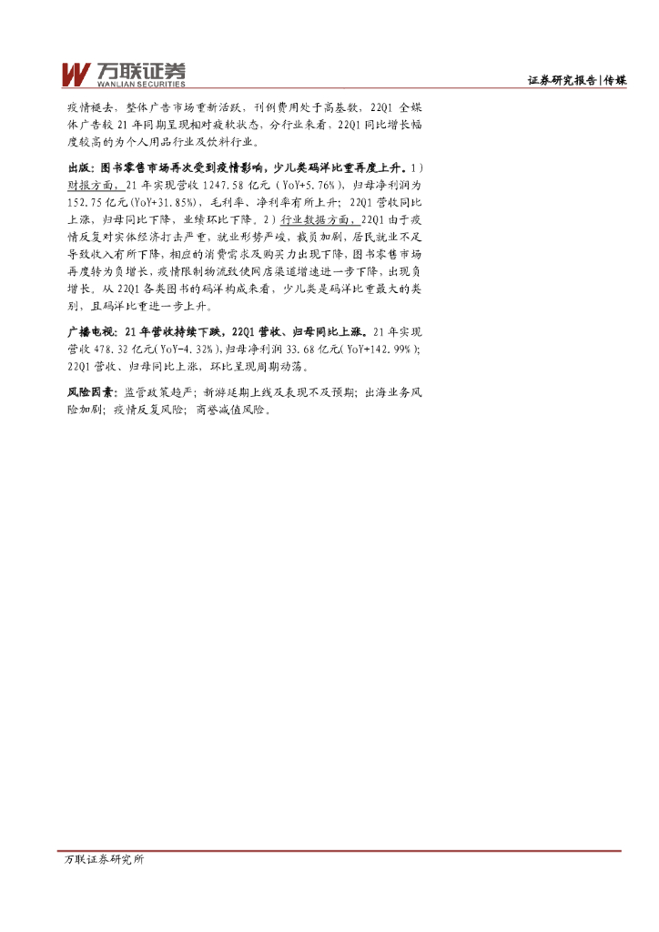 万联证券:传媒行业深度报告:疫情反复22Q1业绩有所回落,基金重仓配置持续低配.pdf