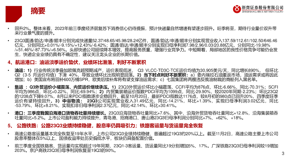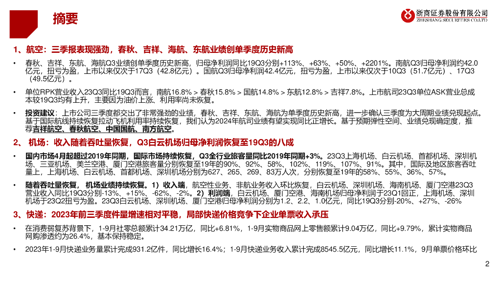 浙商证券:交运行业2023年三季报业绩综述:航空业绩创新高,快递航运淡季承压.pdf