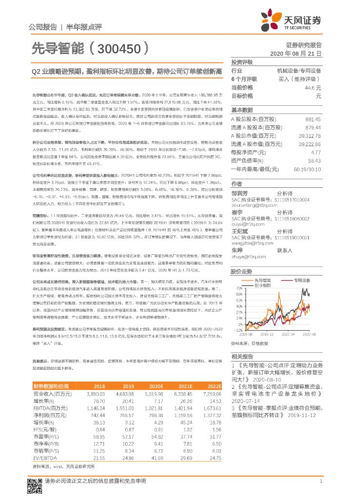 天风证券:先导智能(300450)-Q2业绩略逊预期,盈利指标环比明显改善,期待公司订单续创新高.pdf