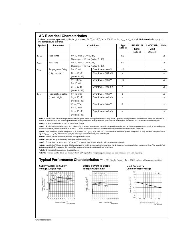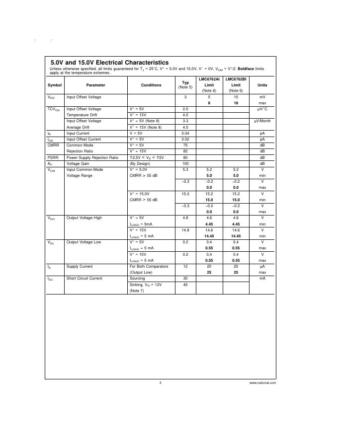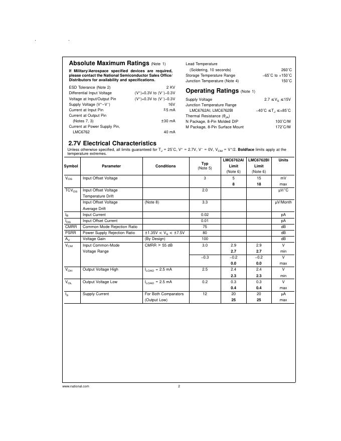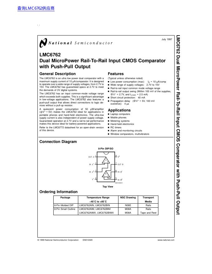 National Semiconductor LMC6762 Dual MicroPower Rail-To-Rail Input CMOS Comparator with Push-Pull Output 数据手册.pdf