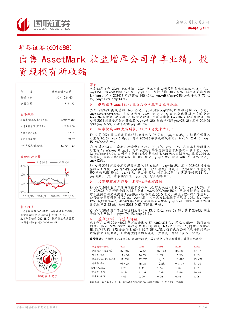 国联证券:华泰证券(601688)-出售AssetMark收益增厚公司单季业绩,投资规模有所收缩.pdf