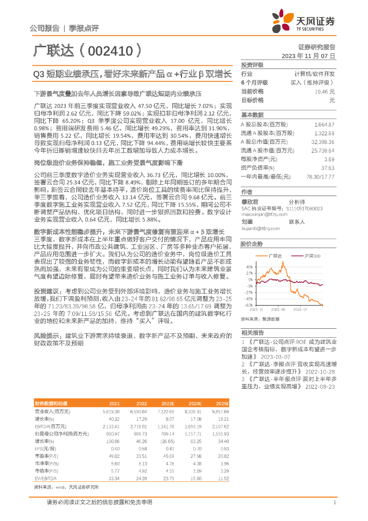 天风证券:广联达(002410)-Q3短期业绩承压,看好未来新产品α+行业β双增长.pdf