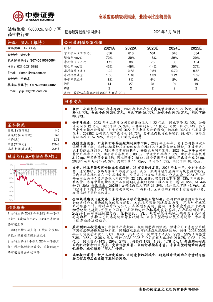 中泰证券:洁特生物(688026)-高基数影响表观增速,业绩环比改善显著.pdf