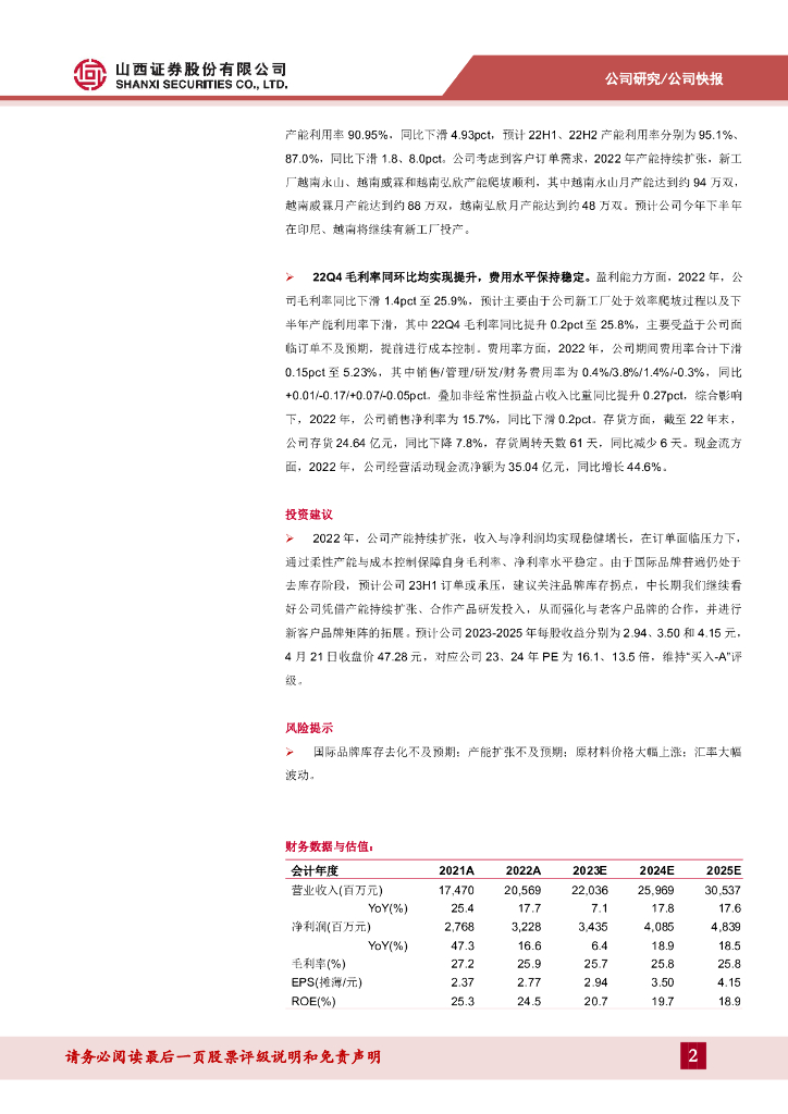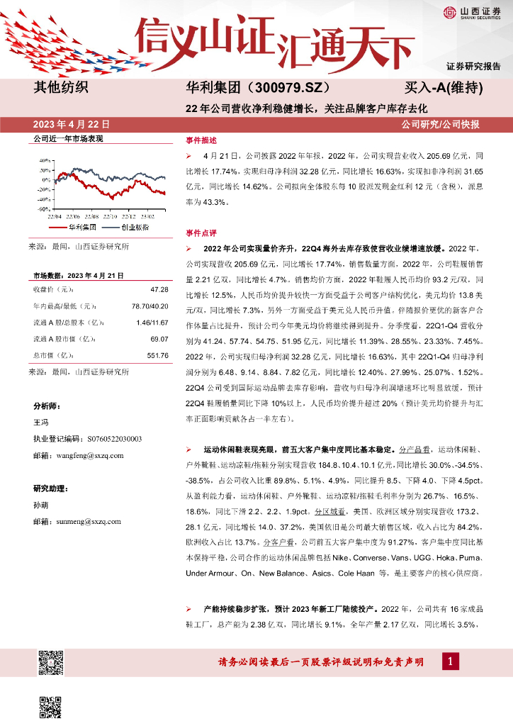 山西证券:华利集团(300979)-22年公司营收净利稳健增长,关注品牌客户库存去化.pdf