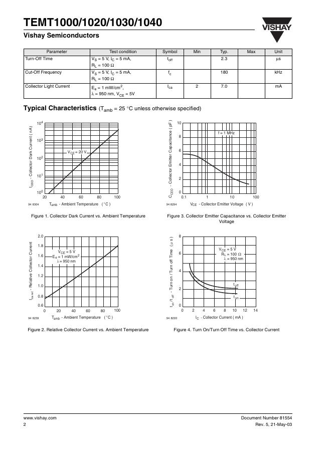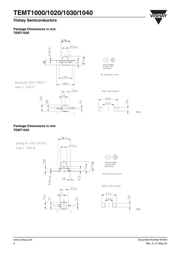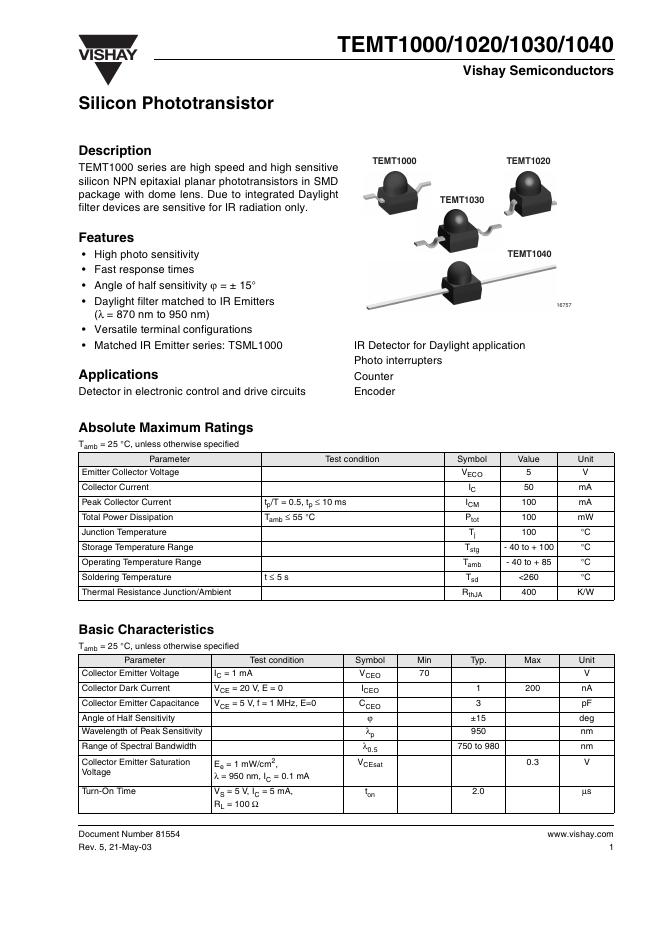 VISHAY SEMICONDUCTOR -TEMT1000/1020/1030/1040 Silicon Phototransistor 数据手册.pdf