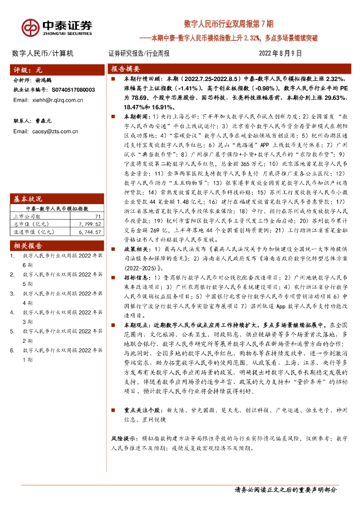 中泰证券:数字人民币行业双周报第7期:本期中泰-数字人民币模拟指数上升2.32%,多点多场景继续突破.pdf