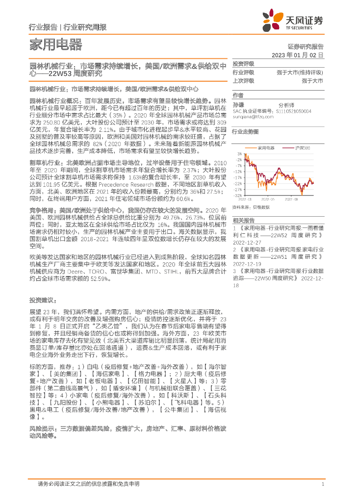 天风证券:家用电器22W53周度研究:园林机械行业:市场需求持续增长,美国/欧洲需求&供给双中心.pdf
