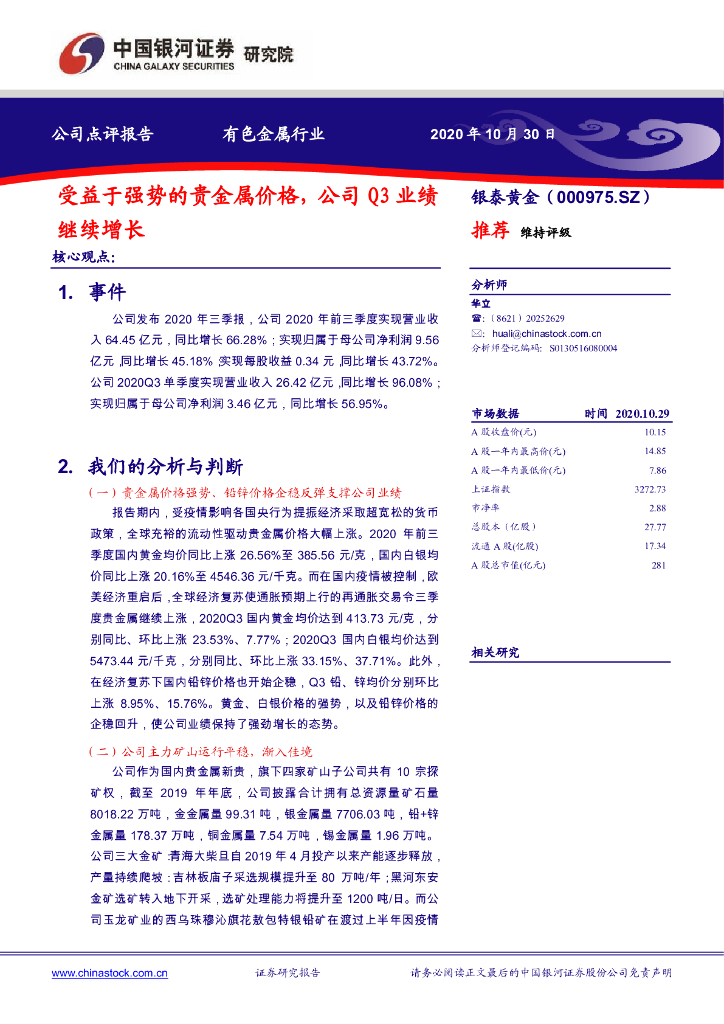 中国银河:银泰黄金(000975)-受益于强势的贵金属价格,公司Q3业绩继续增长.pdf