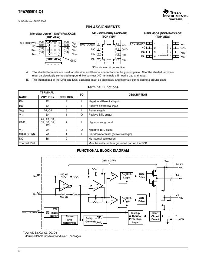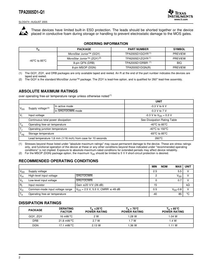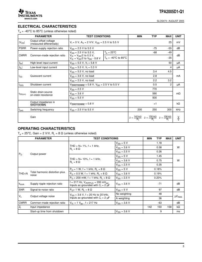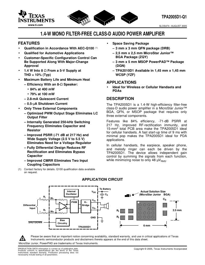 TEXAS INSTRUMENTS TPA2005D1-Q1 1.4-W MONO FILTER-FREE CLASS-D AUDIO POWER AMPLIFIER数据手册.pdf