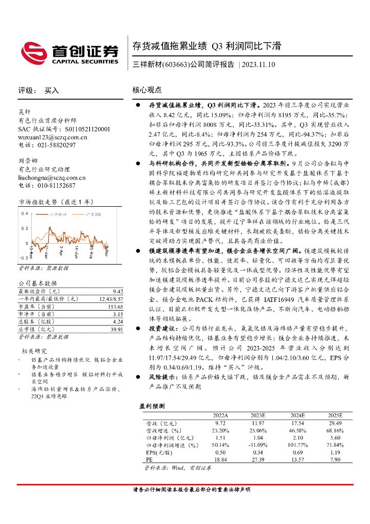 首创证券:三祥新材(603663)-公司简评报告:存货减值拖累业绩,Q3利润同比下滑.pdf