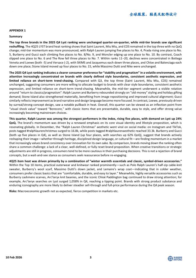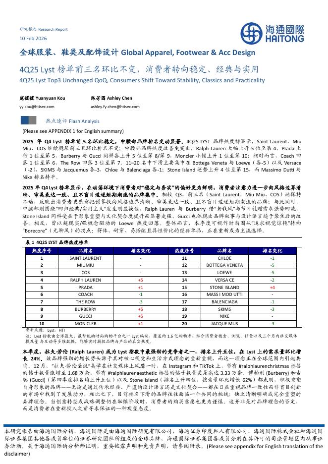 海通国际:全球服装、鞋类及配饰设计:4Q25Lyst榜单前三名环比不变,消费者转向稳定、经典与实用-260211.pdf