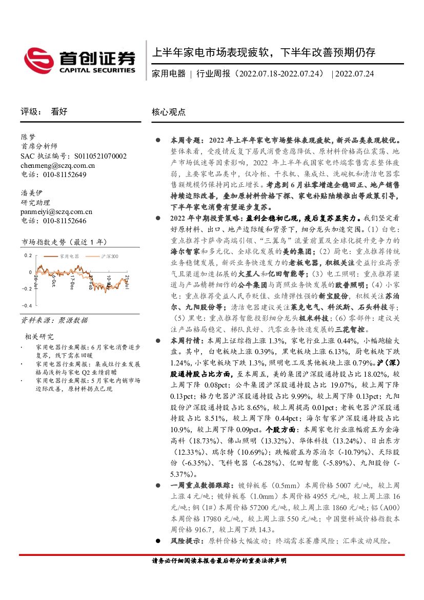 首创证券:家用电器行业周报:上半年家电市场表现疲软,下半年改善预期仍存.pdf