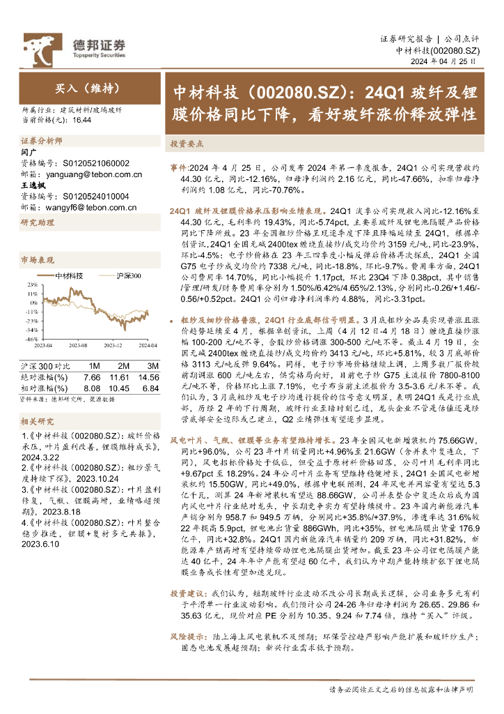德邦证券:中材科技(002080)-24Q1玻纤及锂膜价格同比下降,看好玻纤涨价释放弹性.pdf