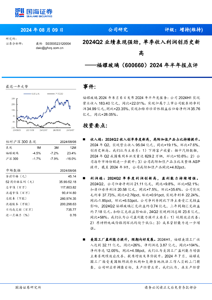 国海证券:福耀玻璃(600660)-2024年半年报点评:2024Q2业绩表现强劲,单季收入利润创历史新高.pdf