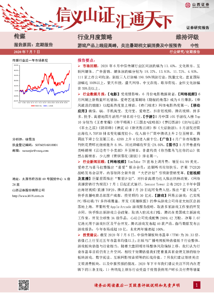山西证券:传媒行业月度策略:游戏产品上线迎高峰,关注暑期档文娱消费及中报预告.pdf