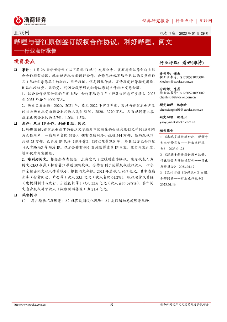 浙商证券:互联网行业点评报告:哔哩与晋江原创签订版权合作协议,利好哔哩、阅文.pdf