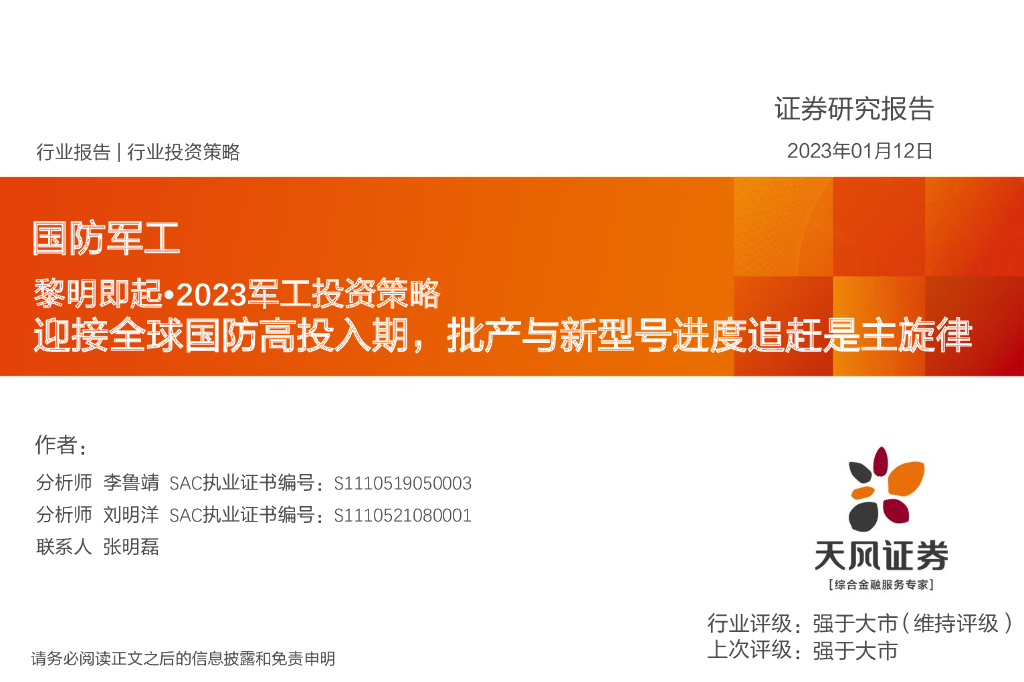 天风证券:黎明即起•2023军工投资策略:迎接全球国防高投入期,批产与新型号进度追赶是主旋律.pdf