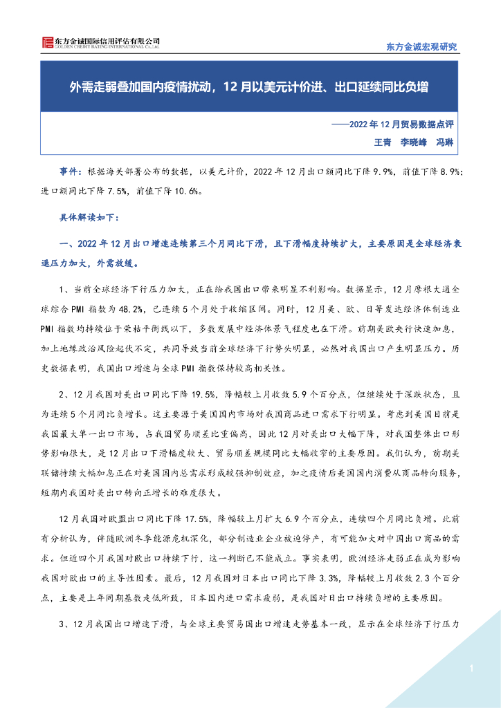东方金诚:外需走弱叠加国内疫情扰动,12月以美元计价进、出口延续同比负增——2022年12月贸易数据点评.pdf