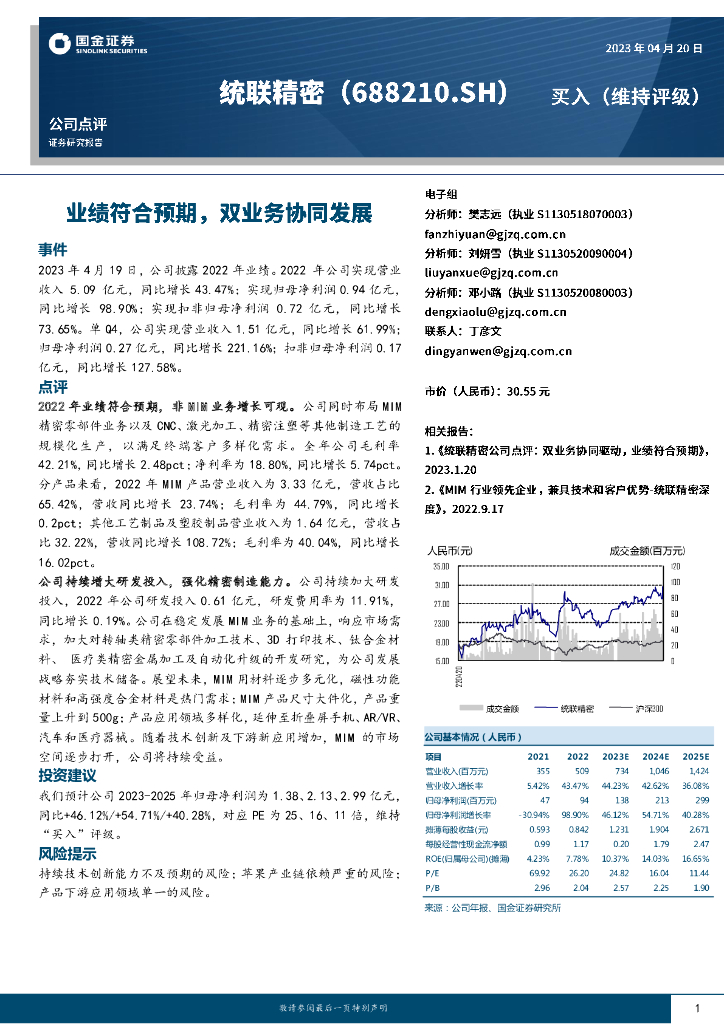 国金证券:统联精密(688210)-业绩符合预期,双业务协同发展.pdf