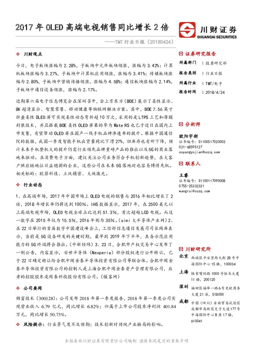 川财证券:TMT行业日报:2017年OLED高端电视销售同比增长2倍.pdf