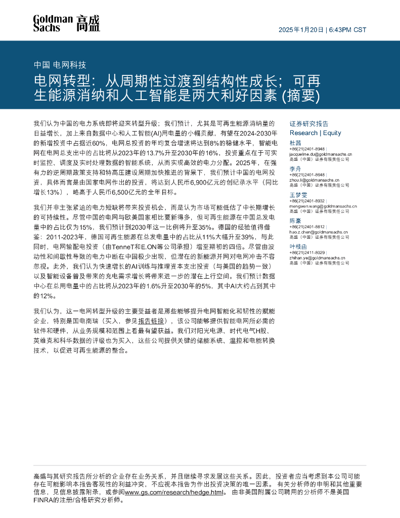 高盛:电网转型:从周期性过渡到结构性成长;可再生能源消纳和人工智能是两大利好因素(摘要).pdf