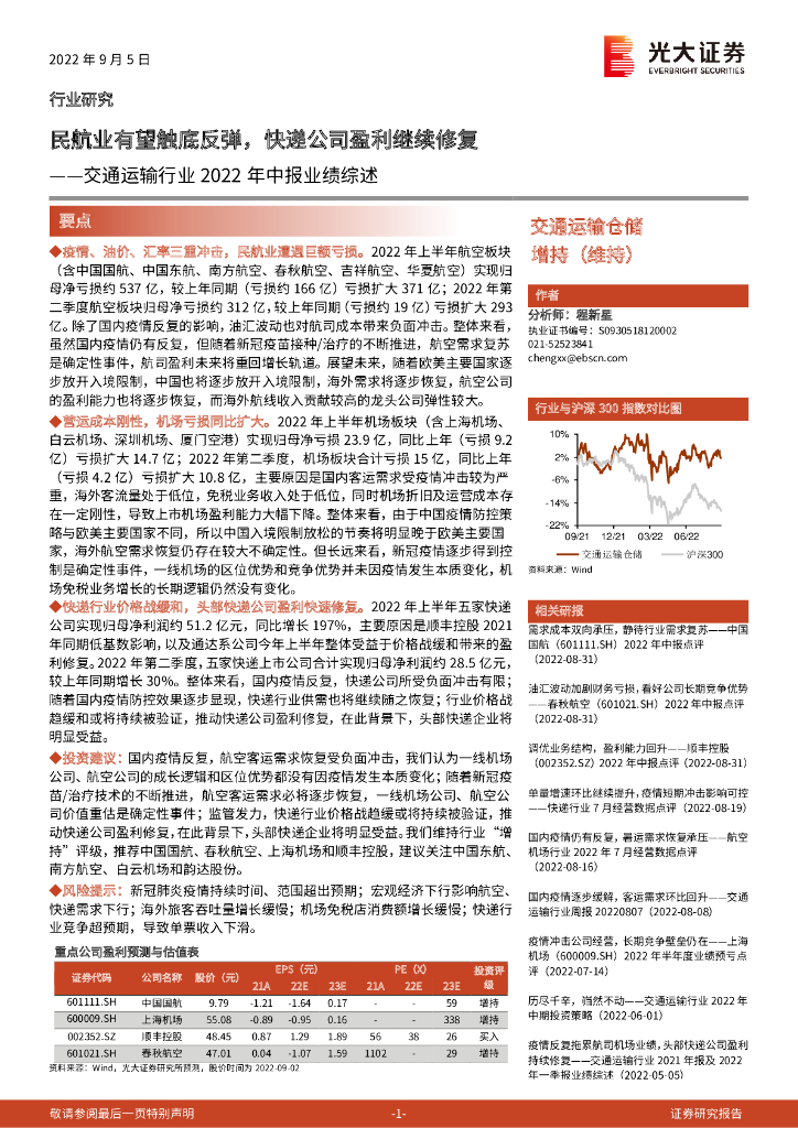 光大证券:交通运输行业2022年中报业绩综述:民航业有望触底反弹,快递公司盈利继续修复.pdf