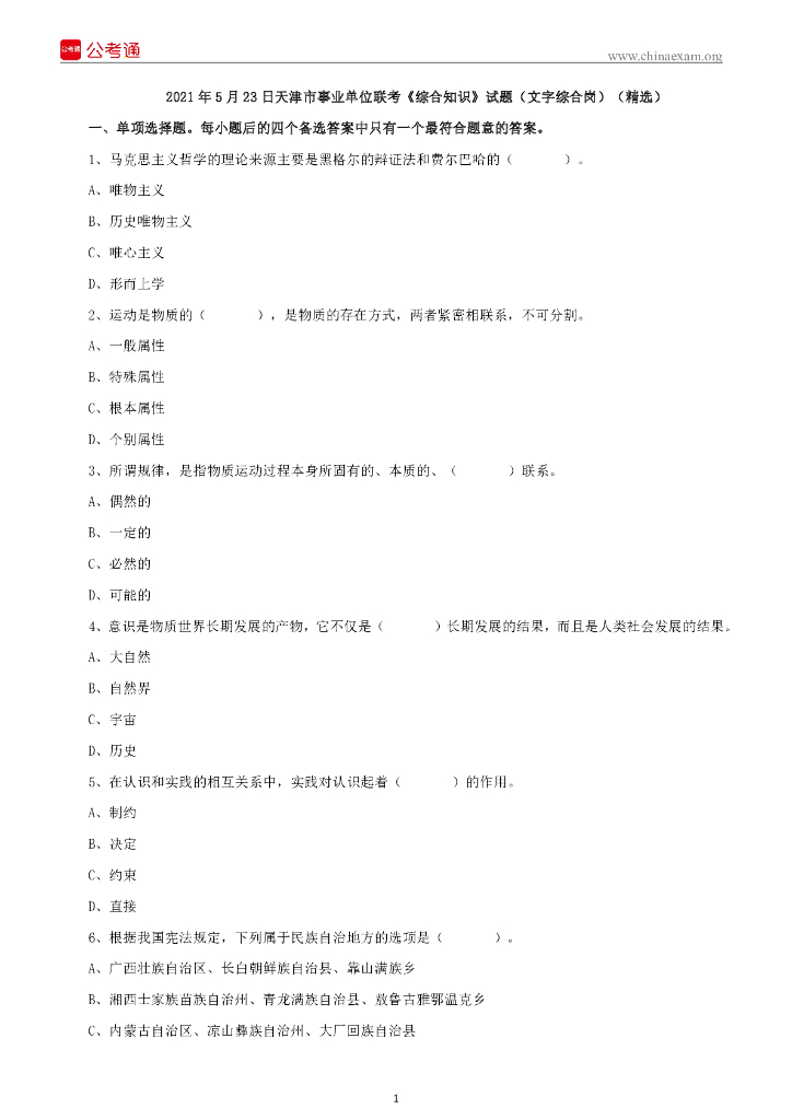 2021年5月23日天津事业单位联考《综合知识》(文字综合岗)(精选).pdf