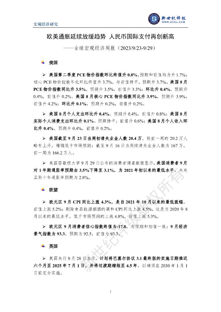 新世纪评级:欧美通胀延续放缓趋势 人民币国际支付再创新高——全球宏观经济周报.pdf