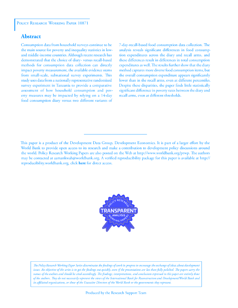 世界银行:坦桑尼亚的贫困衡量:日记和回忆方法在食品消费数据收集中的比较(英文版).pdf