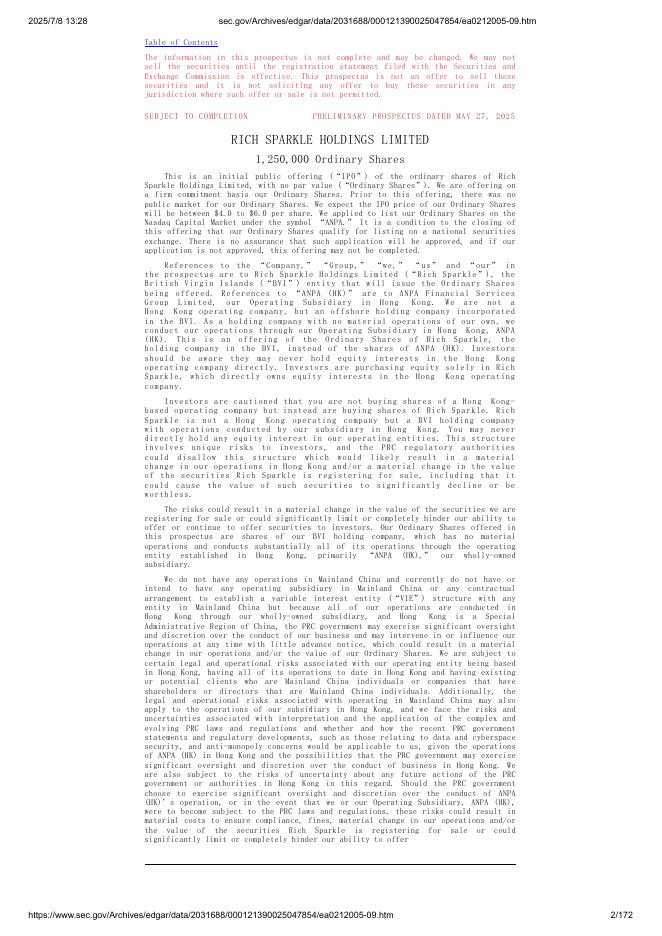 Rich Sparkle Holdings Limited美股纳斯达克IPO上市招股说明书.pdf