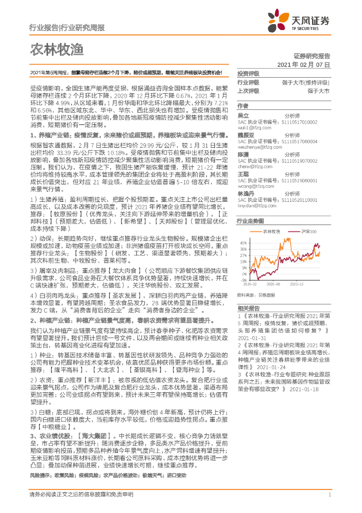 天风证券:农林牧渔2021年第6周周报:能繁母猪存栏连续2个月下降,猪价或超预期,继续关注养殖板块投资机会!.pdf