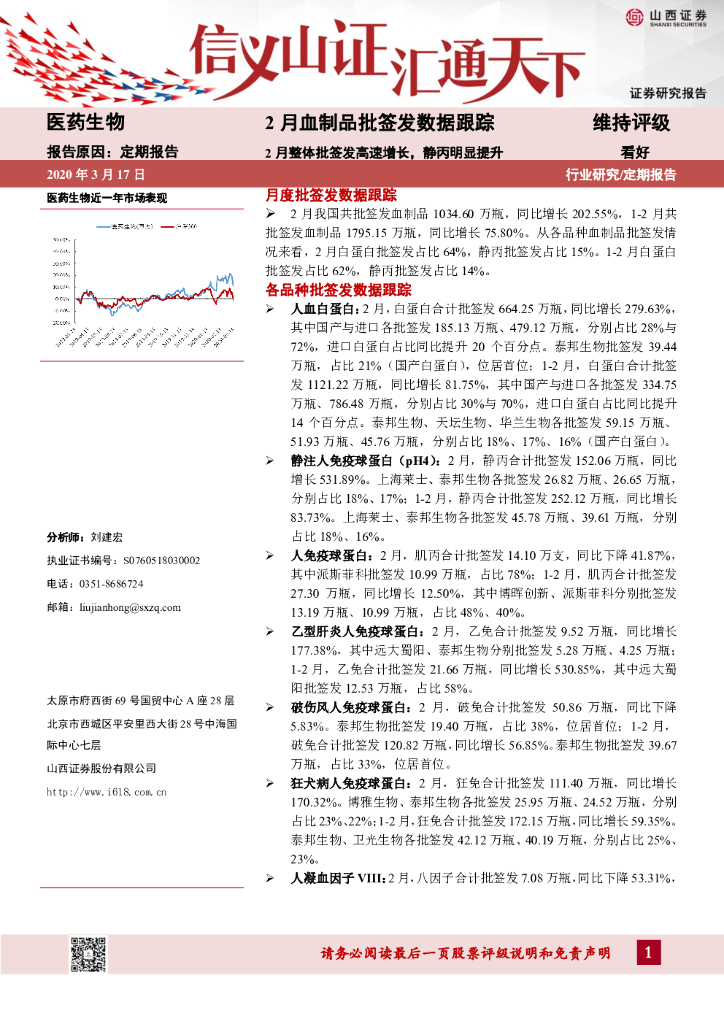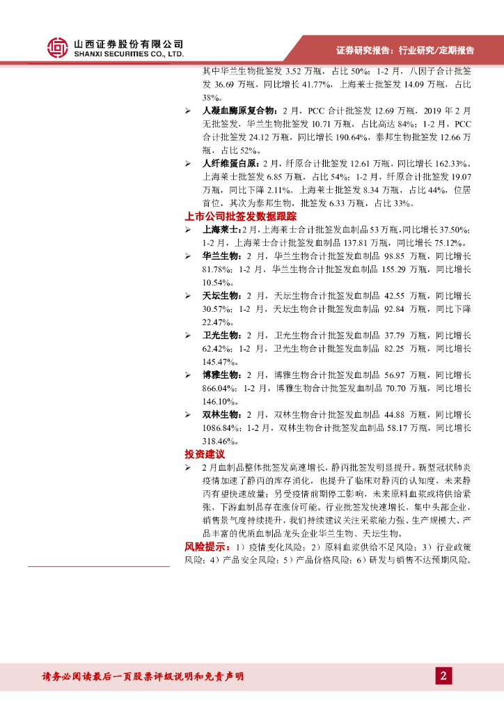 山西证券:2020年2月血制品批签发数据跟踪:2月整体批签发高速增长,静丙明显提升.pdf