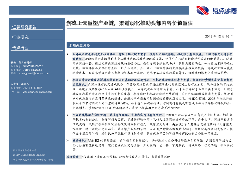 信达证券:5G系列研究(1)——云游戏深度报告:游戏上云重塑产业链,渠道弱化推动头部内容价值重估.pdf