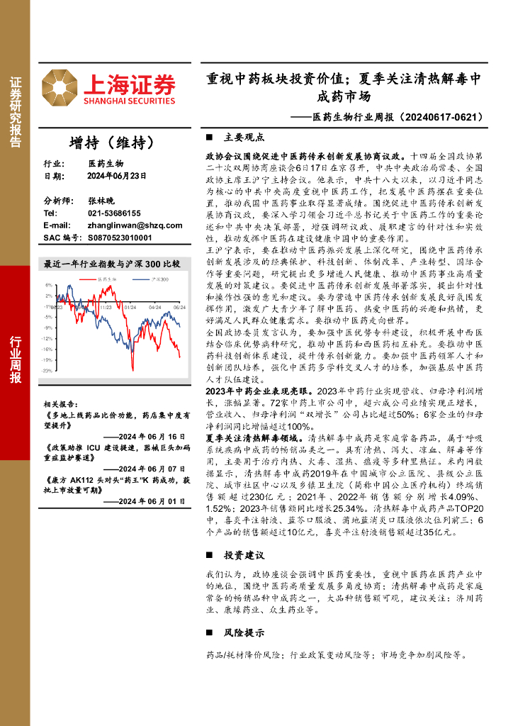 上海证券:医药生物行业周报:重视中药板块投资价值;夏季关注清热解毒中成药市场.pdf