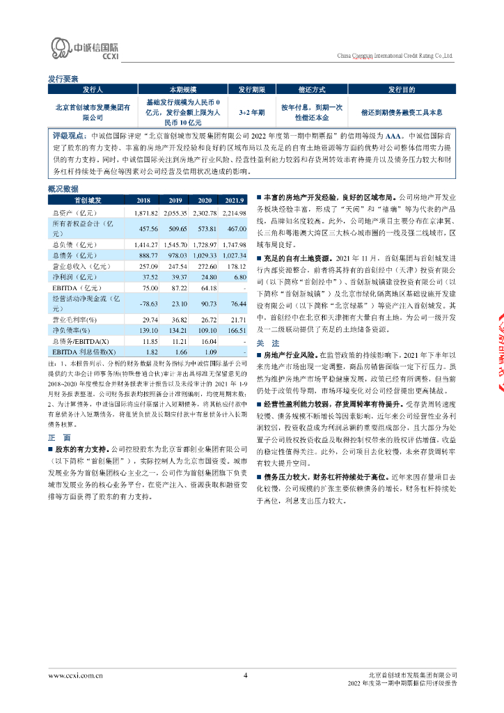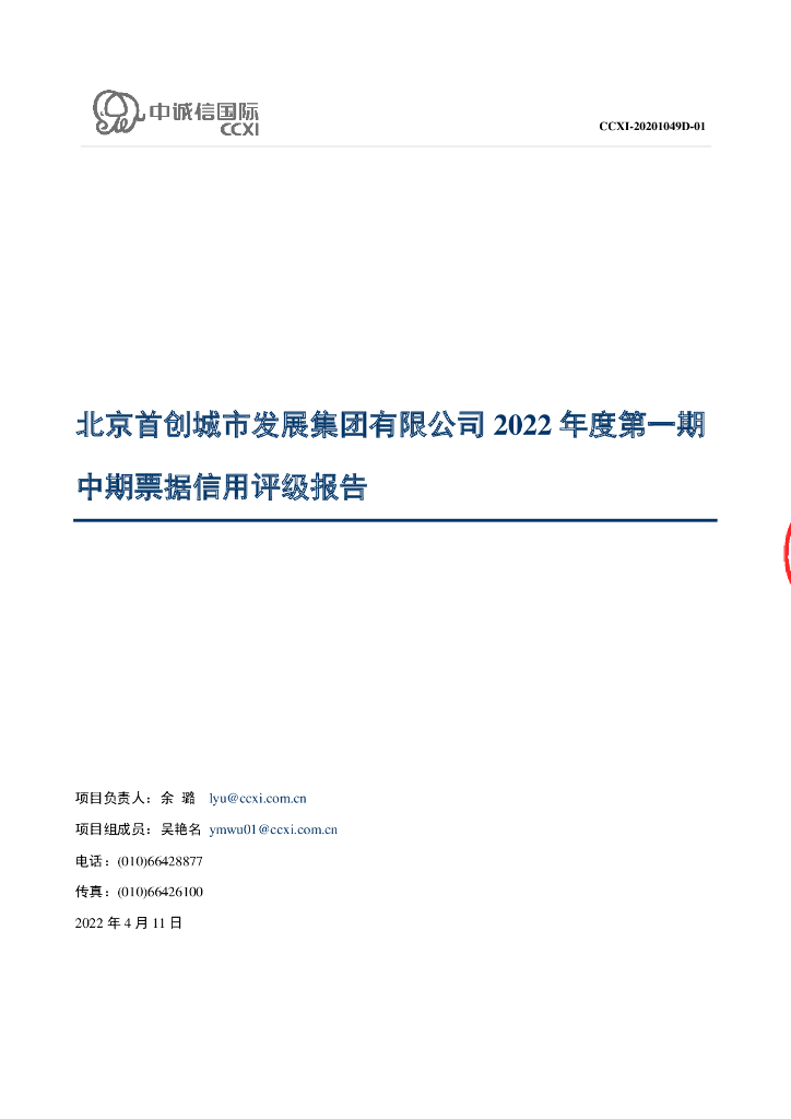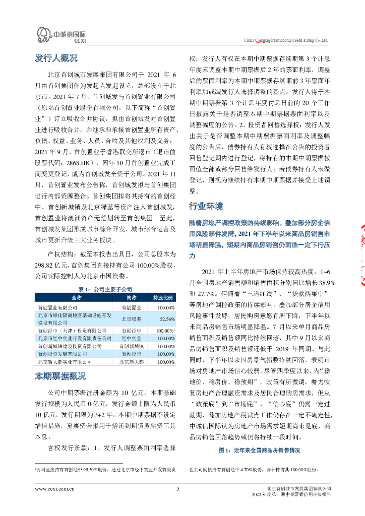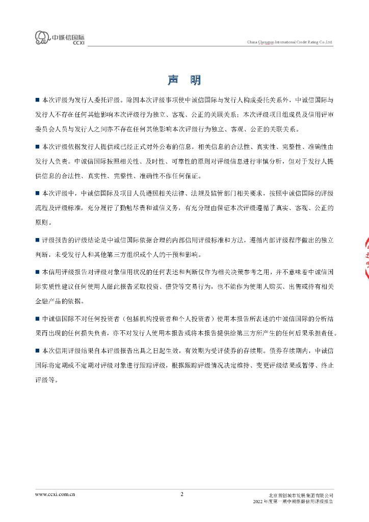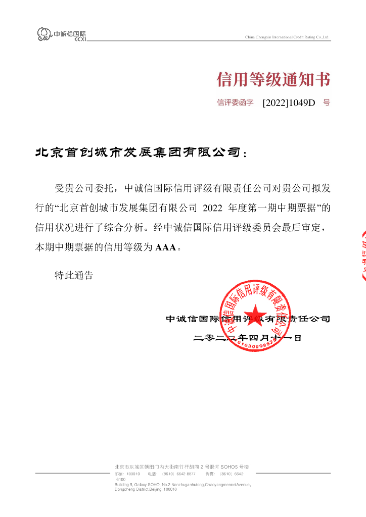 中诚信:北京首创城市发展集团有限公司2022年度第一期中期票据信用评级报告.pdf