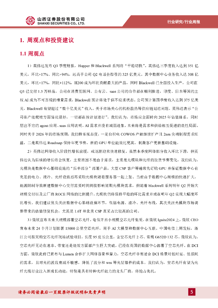 山西证券:通信周跟踪:英伟达财报Blackwell展望乐观,空芯光纤产业化进程开启.pdf